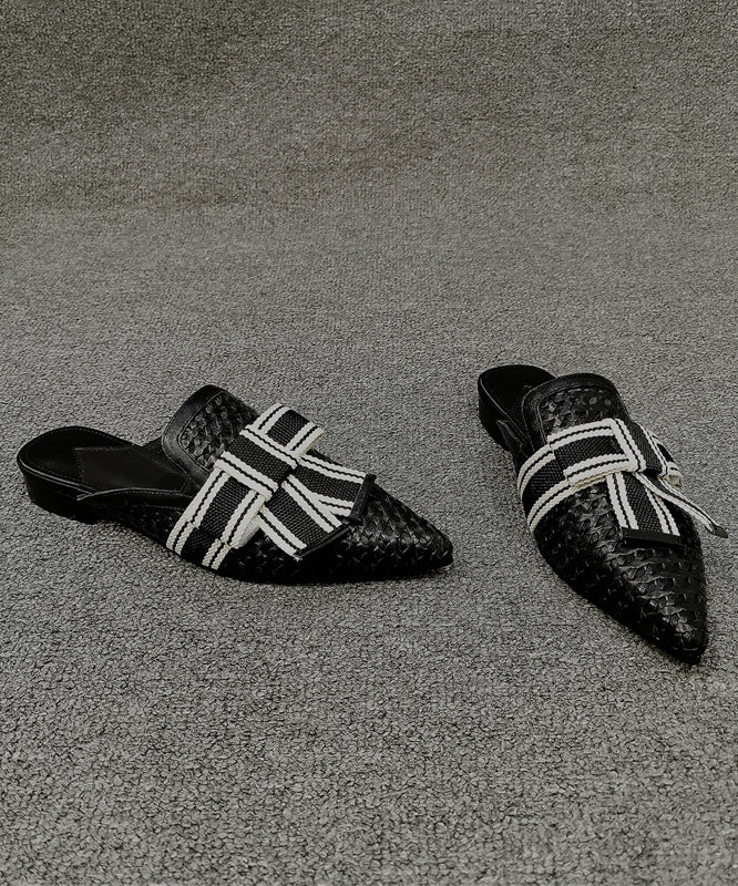 Beautiful Black Bow Splicing Slide Sandals Pointed ToeMade of:-Cowhide Leather Upper.-Rubber sole- cushioned insole.0.98"/2.5cm Heel