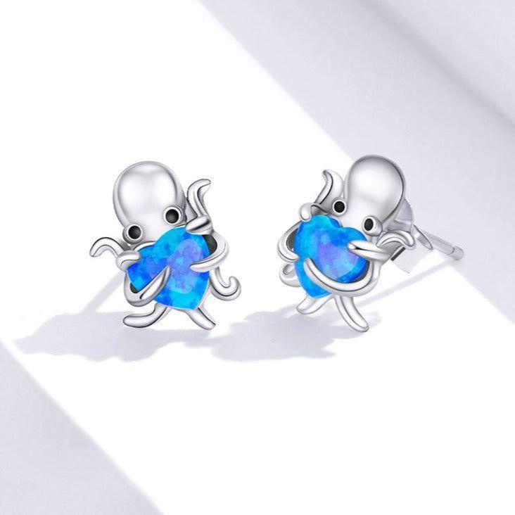 Blue Octopus Heart 925 Sterling Silver Stud Earrings