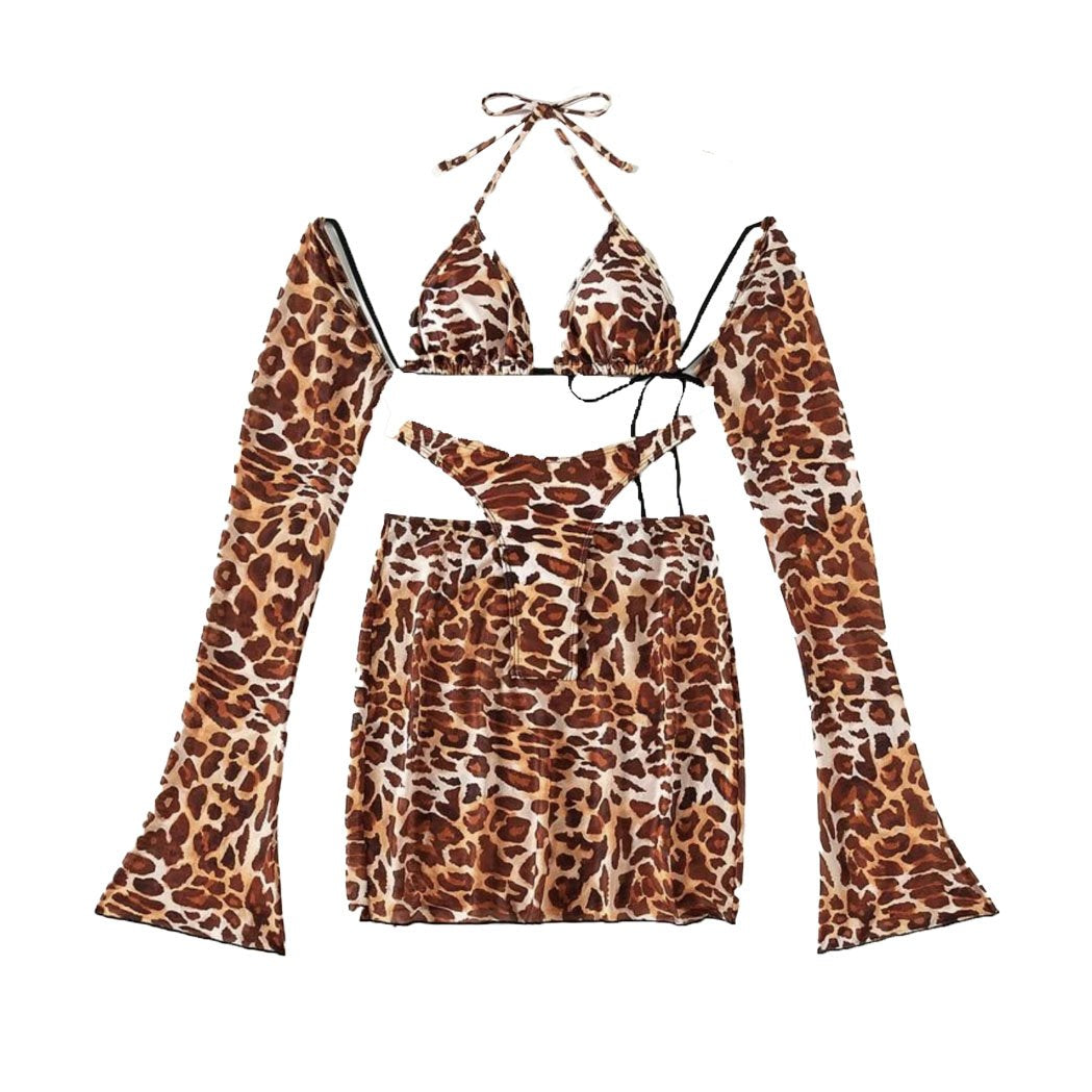 Contrast long sleeve halter self tie mini skirt 4 piece swimwear