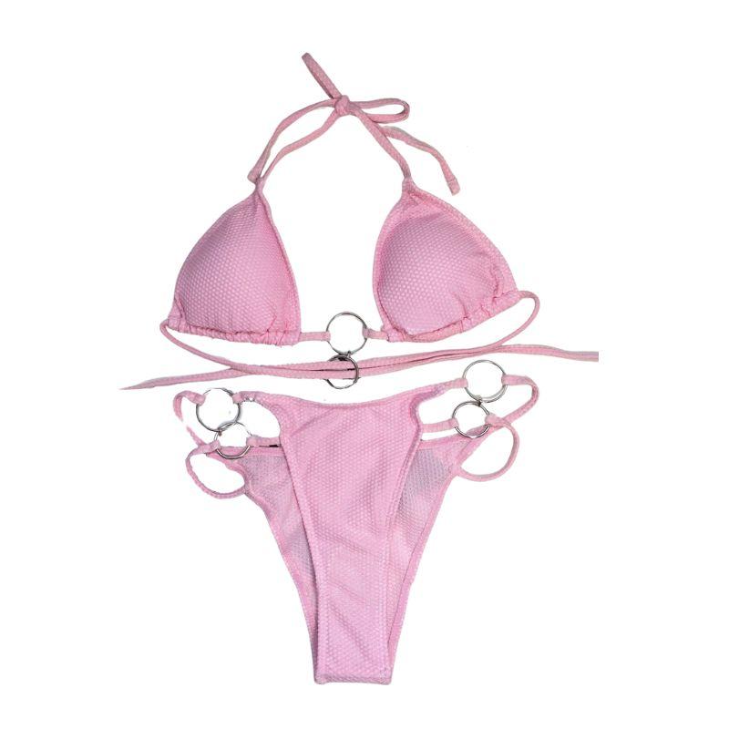 Halter solid o ring self tie padded cross back backless bikini swimwear