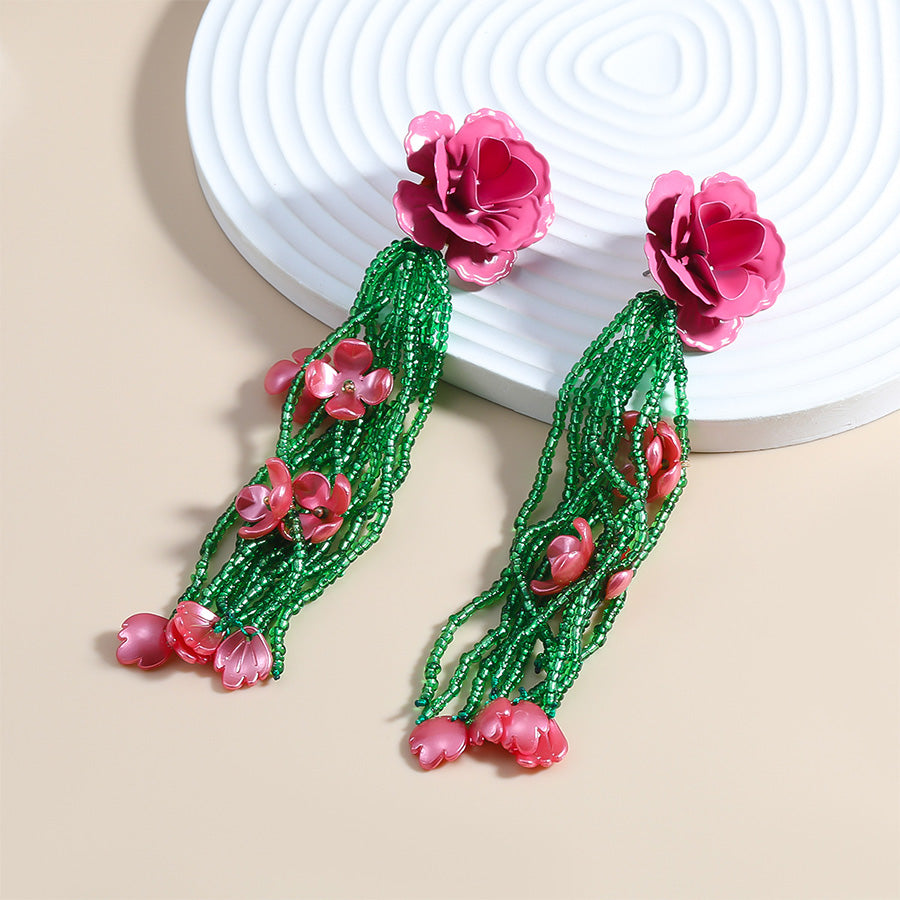 Alloy Lacquered Flower Rice Bead Tassel Earrings