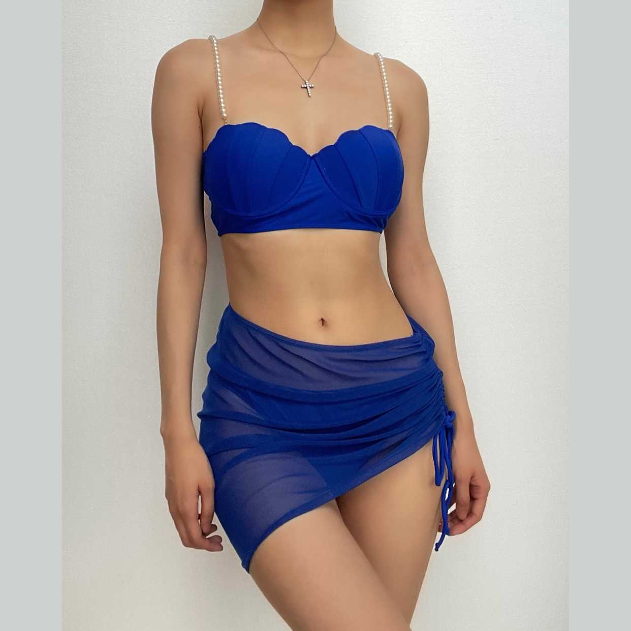 Mesh drawstring padded backless pearl 3 piece swimwear