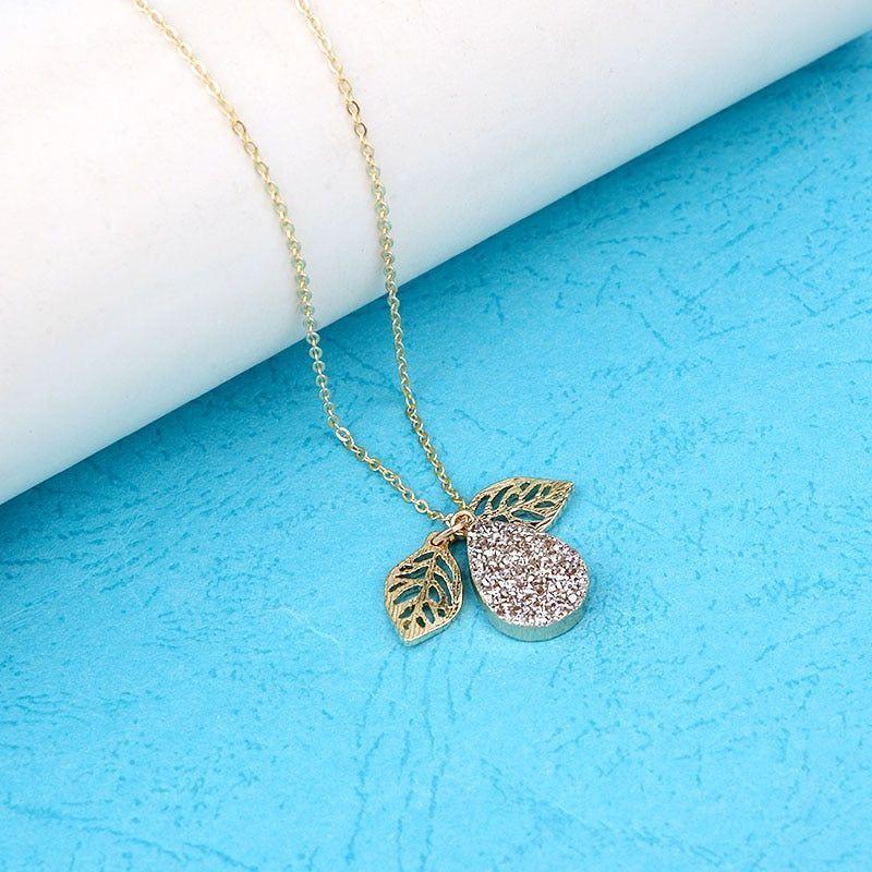 Bohemian Pear Leaf and Druzy Stone Pendant Necklaces Charm Jewelry For Women. Gold Copper Link Chain. Natural Drusy Necklaces For Lady.