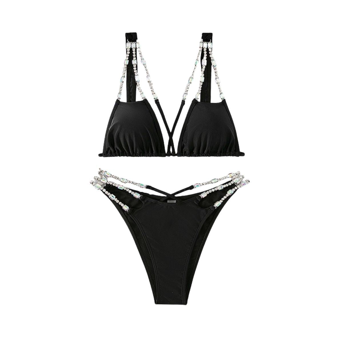 Rhinestone chain cross front backless self tie bikini swimwear