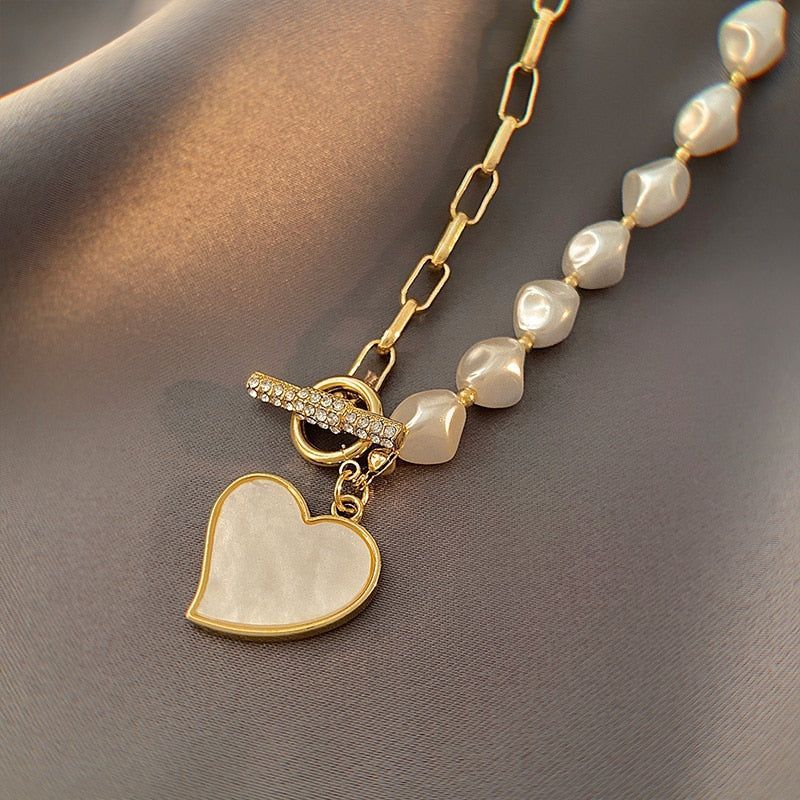 Imitation Baroque Pearl Titanium Steel Necklace Charm Jewelry. Korean Fashion Heart-Shaped Pendant Jewelry. Girl's Clavicle Chain.