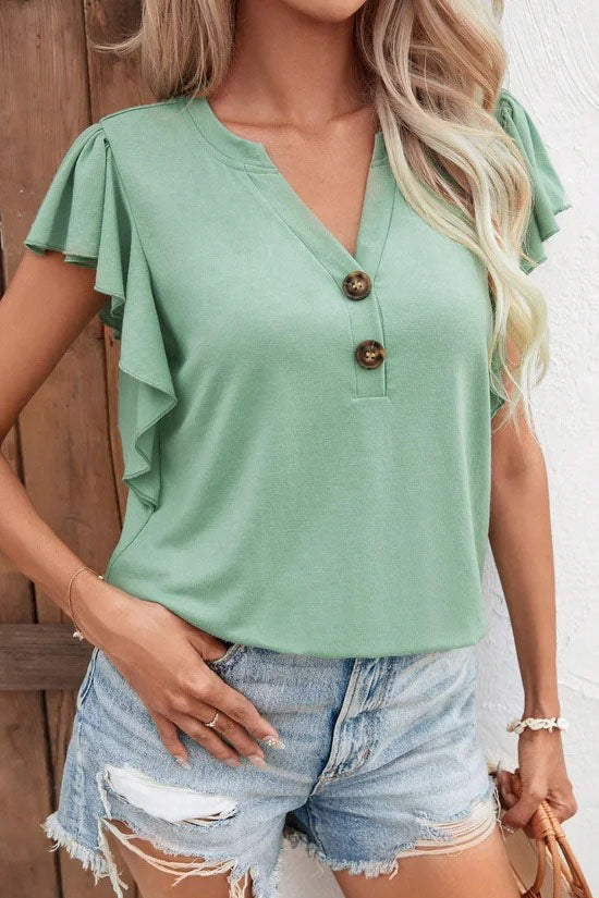This short sleeve top features an elegantly draped V-neckline and eye-catching bell sleeves. The deep V-neck creates a feminine and flattering look while the voluminous sleeves add gorgeous movement.
